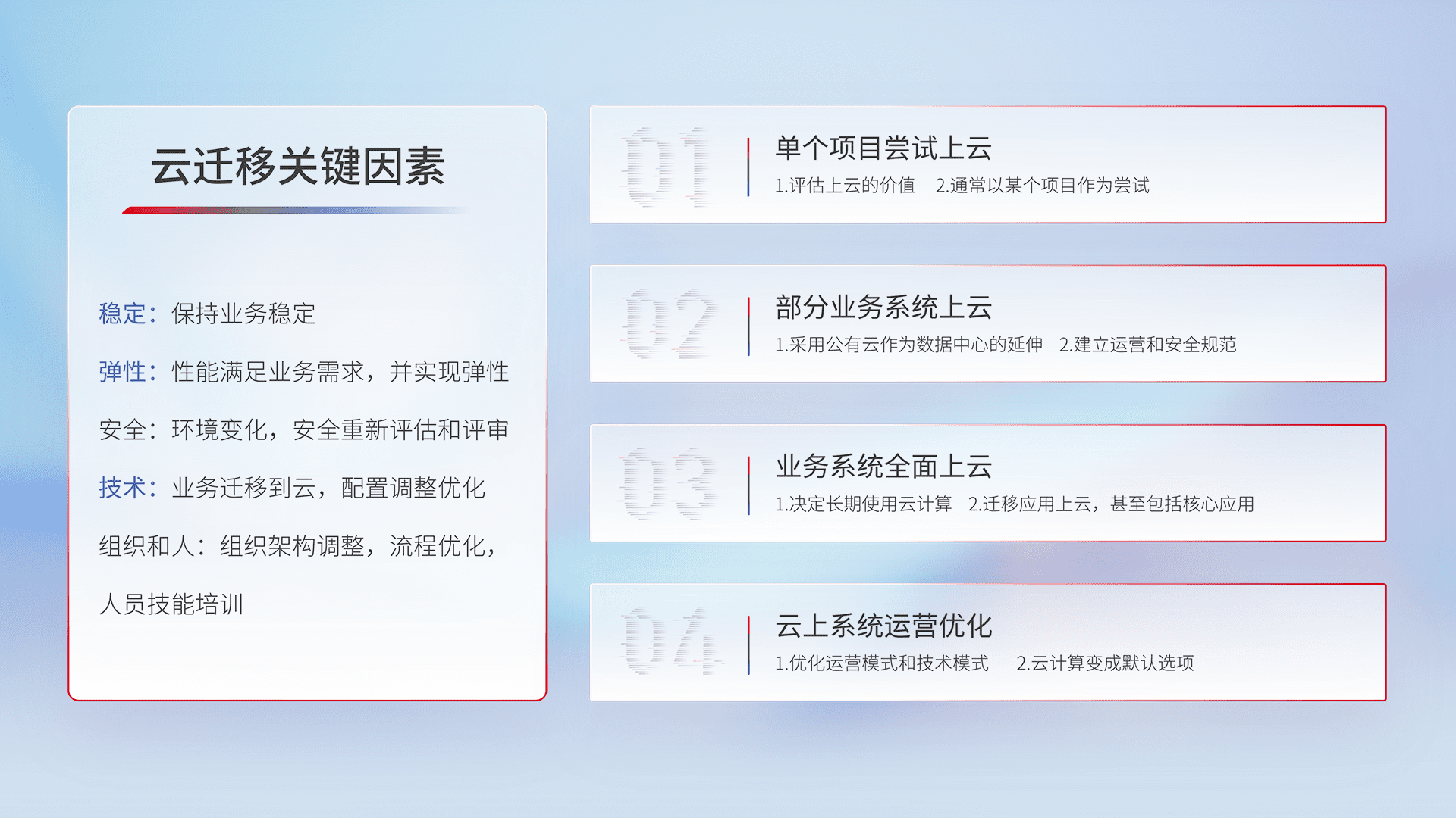 结合实际业务,,,从规划设计、、、云平台选型、、、、云原生改造、、数据迁移、、集成交付,,,迁移全过程为客户识别最佳上云路径,,,做好风险识别管理,,,设计网络架构、、身份权限、、、、安全审计合规、、、操作审计、、日志审计、、、、监控告警策略、、、多站点容灾设计等,,,,对云上基础设施进行整体规划,,,提升IT治理水平,,,以满足弹性、、、、高可用、、高性能的需求。。