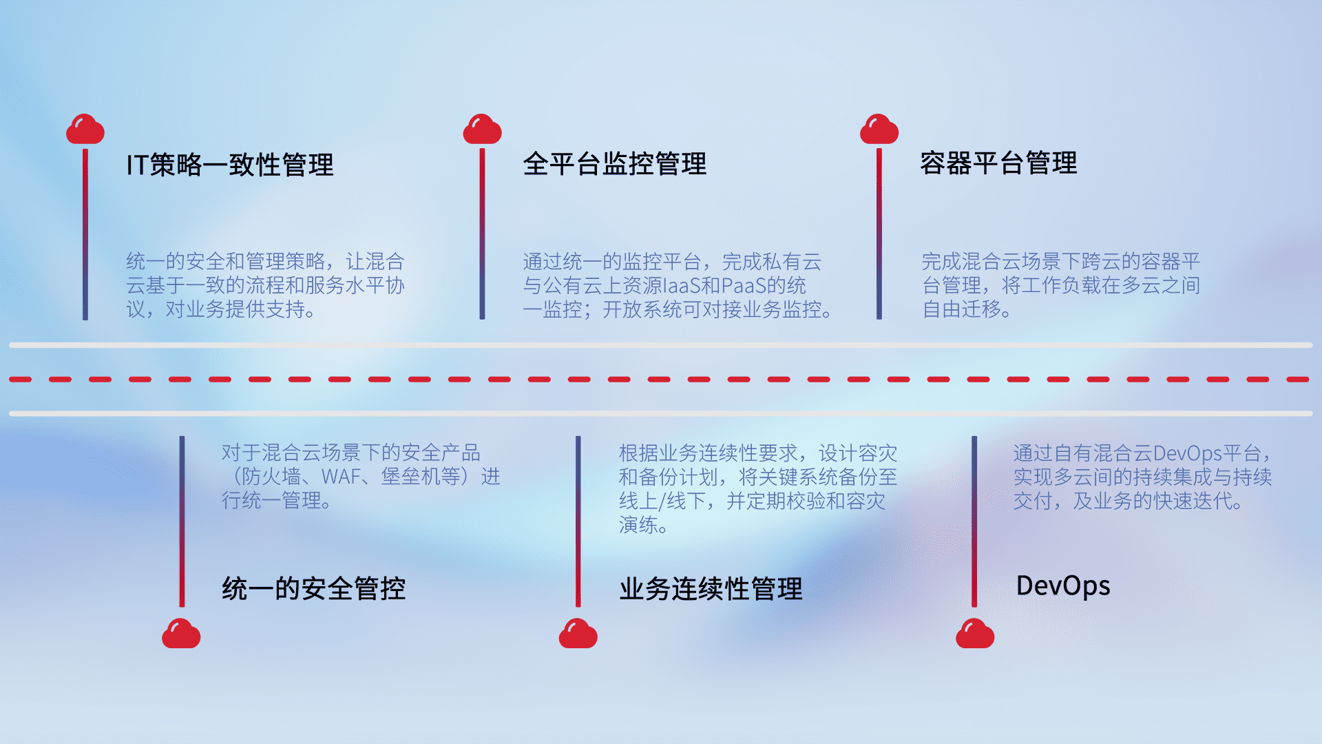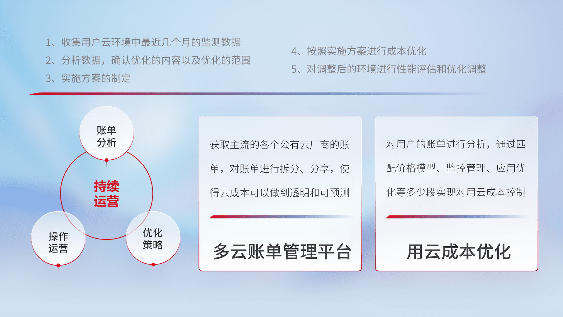 通过多云纳管,,,以统一的资源数据模型把客户的云资源进行抽象和封装,,,进而实现对多云资源的统一操作,,保障云资源管理的可靠性、、、稳定性与可用性。。量身定制化运维内容,,,配置、、开发运维、、、、补丁管理、、备份、、、监控、、认证和访问管理、、、、审计和日常巡检等,,,,保障在用云过程中的可靠度,,稳定度以及高可用率。。。。